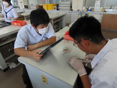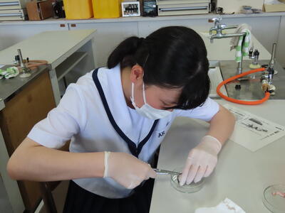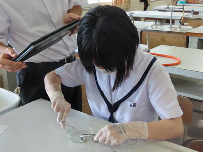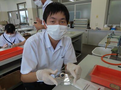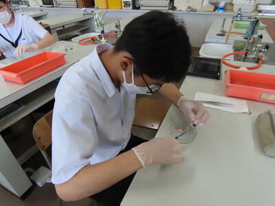 生徒たちは最初は不慣れな手つきで解剖を行っていたものの、途中からは解剖の操作にも慣れ水晶体などの組織を上手く取り出すことができていました。