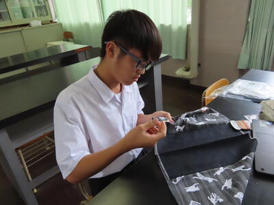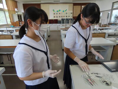 1年生と3年生の科学と人間生活の授業で豚の眼球の解剖を行いました。豚の眼球の大きさや構造は、人の眼球の大きさや構造に近いということがあり、人の眼球の仕組みや構造の理解を深めることを目的として解剖の実習を行いました。