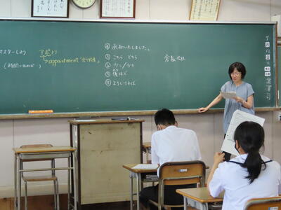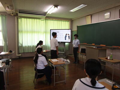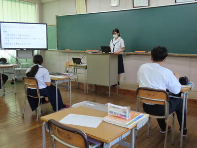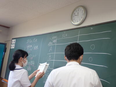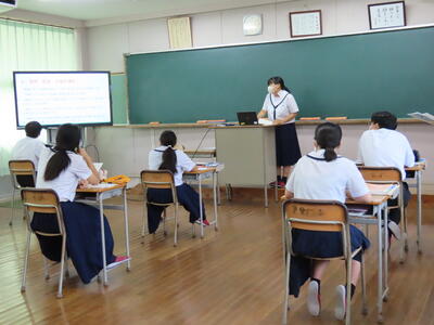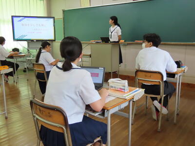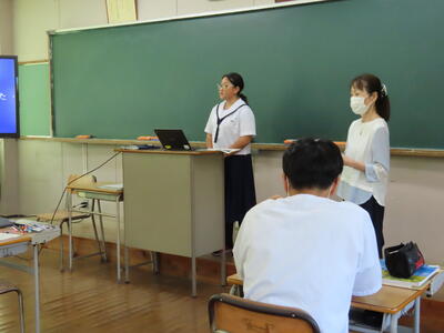 1年生のロングホームルームの様子です。1年生は夏休みに保護者の方、もしくは興味関心がある職業の方へ、仕事内容などについてインタビューを行う予定です。今日はインタビューのアポイントの取り方について学びました。