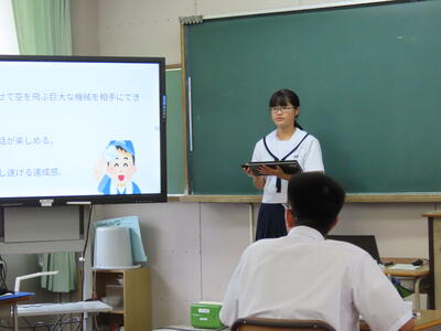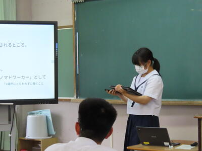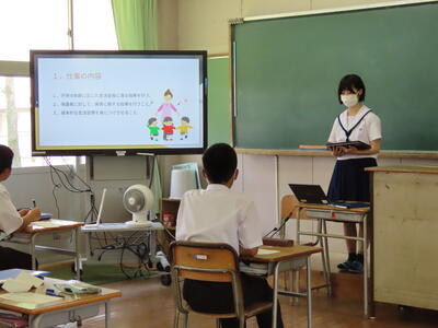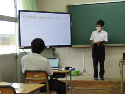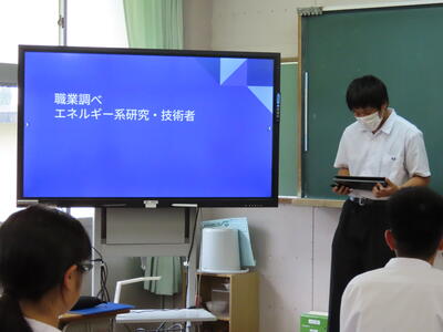 1年生の総合的な探究の時間で発表会が行われました。生徒たちは自分の興味のある職業について仕事の内容や仕事のやりがいなどをスライドにまとめて発表を行いました。