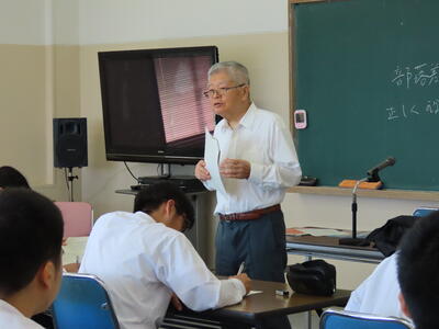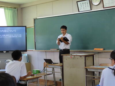 1年生に向けて租税教室が実施されました。天草税務署から講師の先生をお呼びし、租税を中心とした公的負担の意義と必要性などについて講義していただきました。