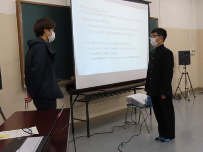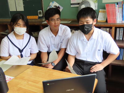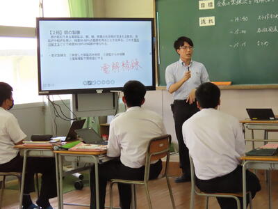 1年生の科学と人間生活の授業の様子です。金属の製錬について班毎に分かれて調べ、調べた内容をスライドにまとめて発表を行いました。発表は教科書の内容だけでなく、Chromebookを活用して詳しい内容まで発表してくれました。