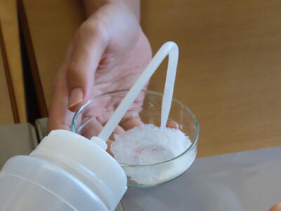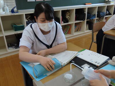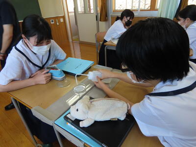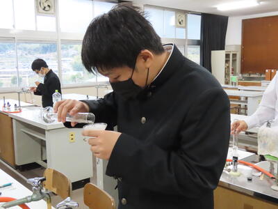 3年生が科学と人間生活の授業で中の紙おむつなどに使用されている高吸水性高分子の実験を行いました。高吸水性高分子に水を加えるとどうなるか?、水を吸収した分子に塩化ナトリウムを加えるとどうなるか?を実際に試してみました。