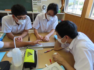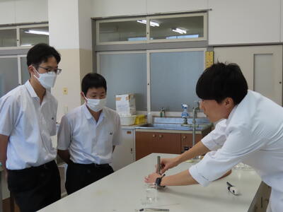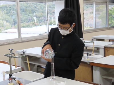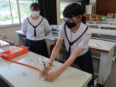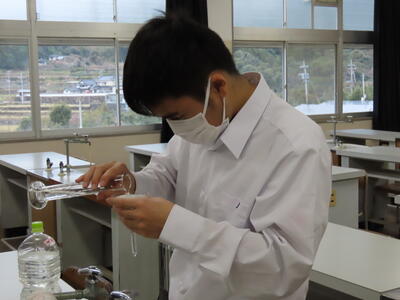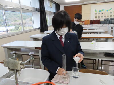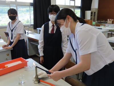 10月17日(火)の3年生の科学と人間生活の授業の様子です。(公開授業週間のため、栖本中の先生2名が参観されました。)銅の炎色反応を利用した塩素の有無の実験と燃焼反応の実験を行いました。生徒たちは担当の先生の指導にしたがいながらガスバーナーを使い、密度や炎色反応、燃焼反応を用いて、ボランティアの際にえびすビーチで採集したプラスチックゴミの種類の特定を行いました。
