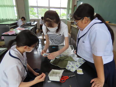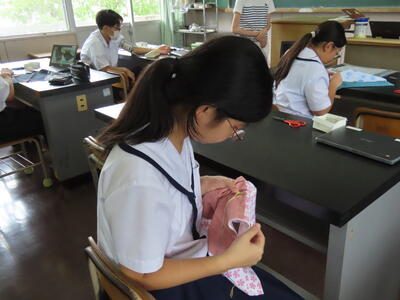 2年生の家庭総合の授業の様子です。現在、2年生は巾着の製作に取り組んでいます。生徒たちは針と糸を上手に扱いながら巾着の製作を行っていました。