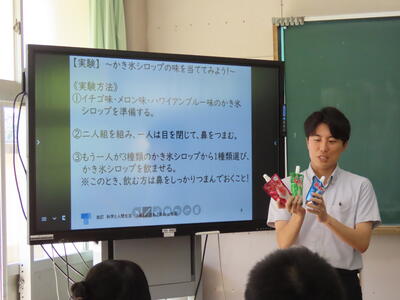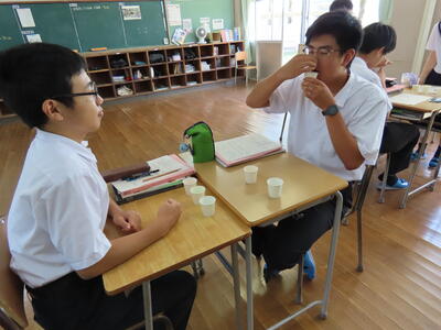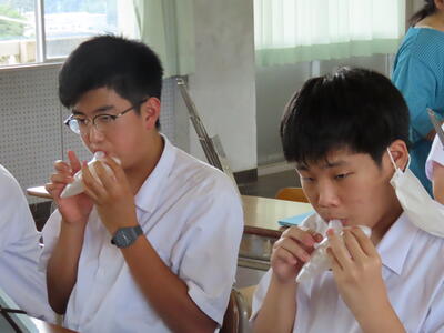 倉岳校は昨日で中間考査が終了し、本日より通常授業が再開しました。本日の1年生の科学と人間生活では、香料と甘味料と着色料に注目して学習し、「かき氷のシロップの味はすべて同じなのか?」について実験を行いました。