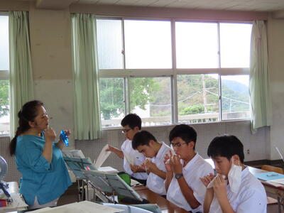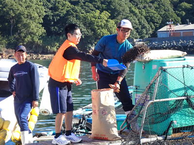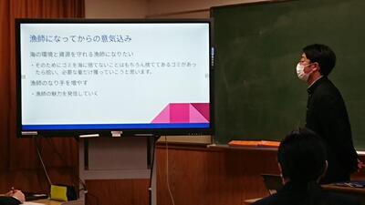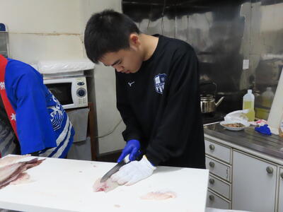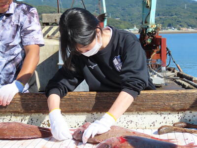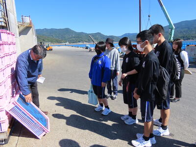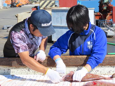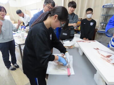 10月23日(月)、1年生が漁業体験教室に参加しました。養殖業について学んだり、生簀で給餌体験、神経抜き体験や捌き方体験を行いました。
