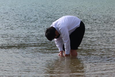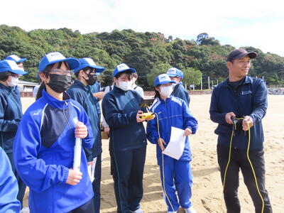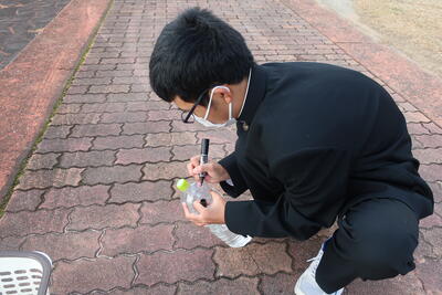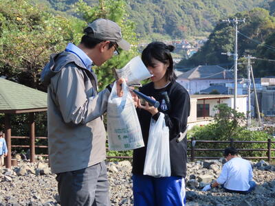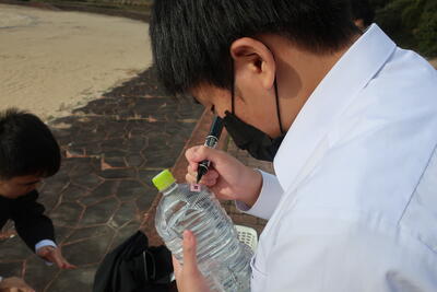 1月15日(月)の1年生の総合的な探究の時間の様子です。生徒たちはマイクロプラスチック班と動画班に分かれて課題研究を行っており、現在、マイクロプラスチック班はえびすビーチにマイクロプラスチックが存在するのかを検証しようとしています。1月15日(月)はえびすビーチの海水採取に行ってきました。