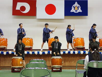 秋桜祭のオープニングで実施予定のえびす太鼓の練習が始まりました。えびす太鼓保存会の方に指導していただき、総合文化部の生徒と有志の生徒により演奏が行われます。