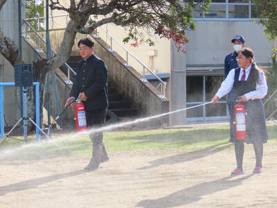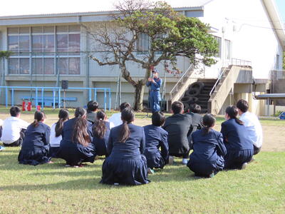 11月14日(火)、倉岳中学校と合同で中高避難訓練が行われました。避難訓練をとおして災害発生時の避難の順序や避難方法などを確認することができました。避難後は天草広域連合中央消防署倉岳分署の方より講評をいただき、防災学習も行いました。