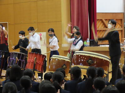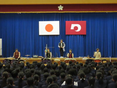 11月28日(火)、天草高校本校で行われた芸術鑑賞に参加しました。世界的太鼓奏者のヒダノ修一さんとタップダンスとヒップホップを融合したステージが行われ、太鼓の演奏を聞いたり、太鼓の演奏体験をしたりしました。