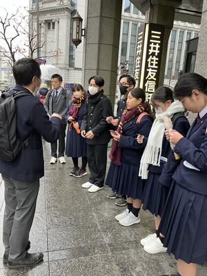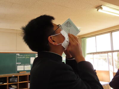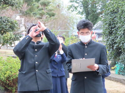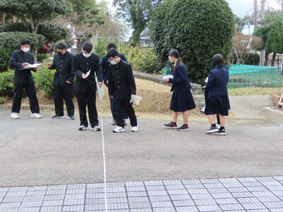 1月15日(月)の授業の様子です。前回の授業で仰角(水平方向と見上げた視線の方向とのなす角)を測る道具カクシリキを作り、今回の授業ではカクシリキとメジャーを利用して建物と人の距離校舎の屋上を見上げたときの仰角を測り、校舎の高さを三角比を利用して測量しました。