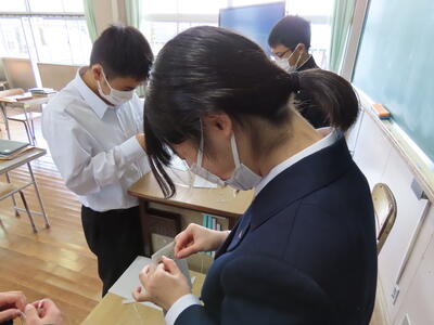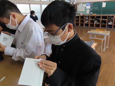 1月12日(金)の1年生の数学の授業の様子です。1年生は今回、次回の授業で三角比を利用して校舎の高さを求めようとしています。今日の授業では三角比を利用するための準備として見上げた角度を測るための道具カクシリキを作りました。