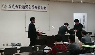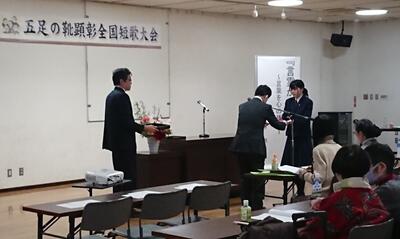 1月13日(土)、天草市民センター展示ホールにおいて、第38回五足の靴顕彰全国短歌大会の表彰式がありました。倉岳校からも応募し、3年生が高校生の部で秀逸1名と入選1名の受賞となりました。歌人の塚本諄先生のお話も伺うことができました。