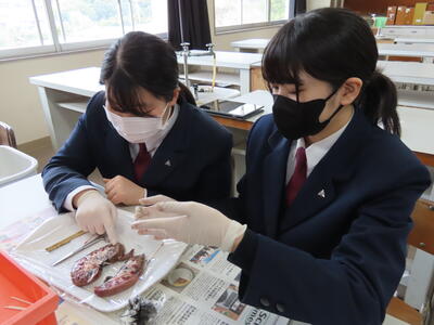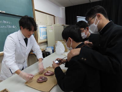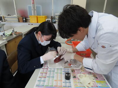 1月19日(金)の3年生の生物分野の授業で人体の構造を理解するために豚の腎臓の解剖を行いました。