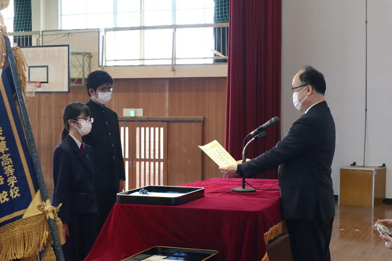 表彰式では、心のきずなを深めるための標語で優秀賞、五足の靴顕彰全国短歌大会高校生の部で佳作を受賞した生徒や、実用英語技能検定準2級を取得した生徒、1年間皆勤・精勤だった生徒の表彰がありました。