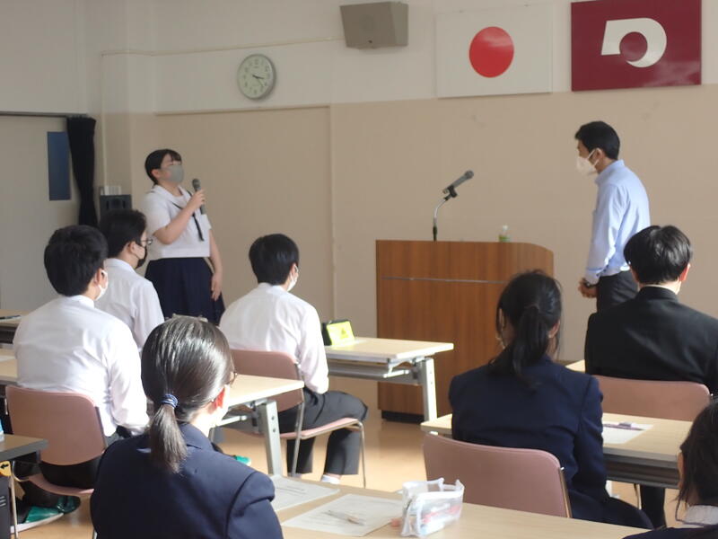 質疑応答では、2名の生徒が手を挙げて質問や感想を述べました。手を挙げるという勇気のいる行動ができるのは『素晴らしい』とお褒めの言葉をいただきました。