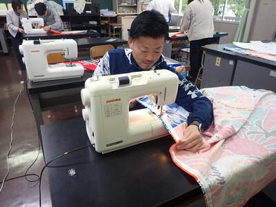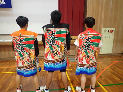 衣装は、なんと職員の手作りです!大漁旗をアレンジして制作しました。慣れないミシンに奮闘しながら、何とか全員分をそろえることができました。