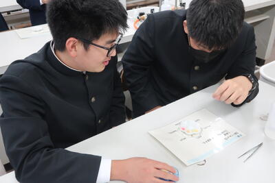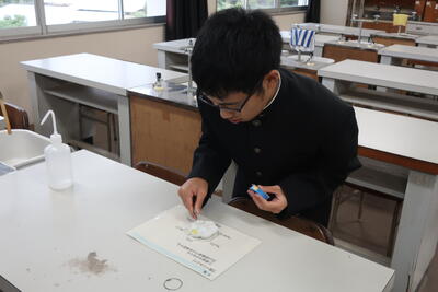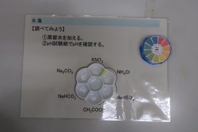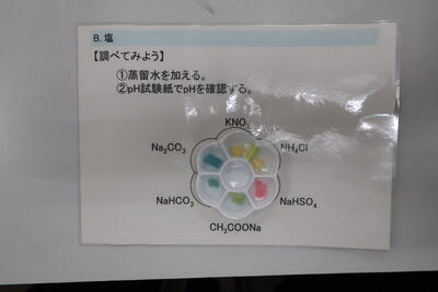 11月12日(水)に化学基礎の授業で塩の水溶液の性質を調べる実験を行いました。酸と塩基の中和反応によって生じる塩(えん)は、水中で加水分解という反応を起こし、酸性・中性・塩基性のいずれかの性質を示します。