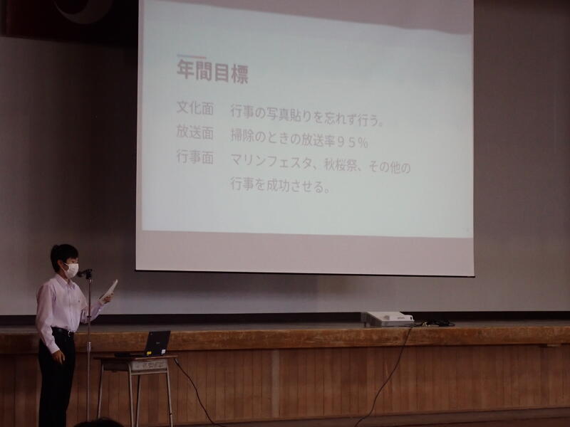 5月12日(木)、生徒会進行のもと生徒総会を実施しました。まず、各種委員長が委員会の目標及び年間活動計画についての発表を行いました。各種委員会の活動内容について、全校生徒が知る良い機会となりました。
