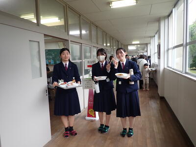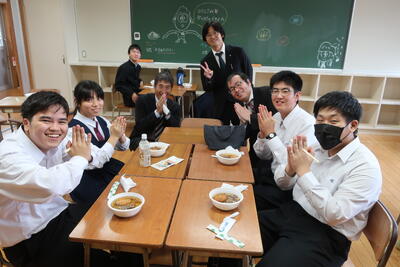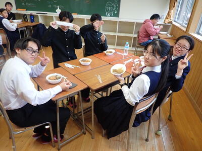 昼休みの様子(育友会によるカレーとうどんをおいしそうに頬張る生徒たちと旧職員)