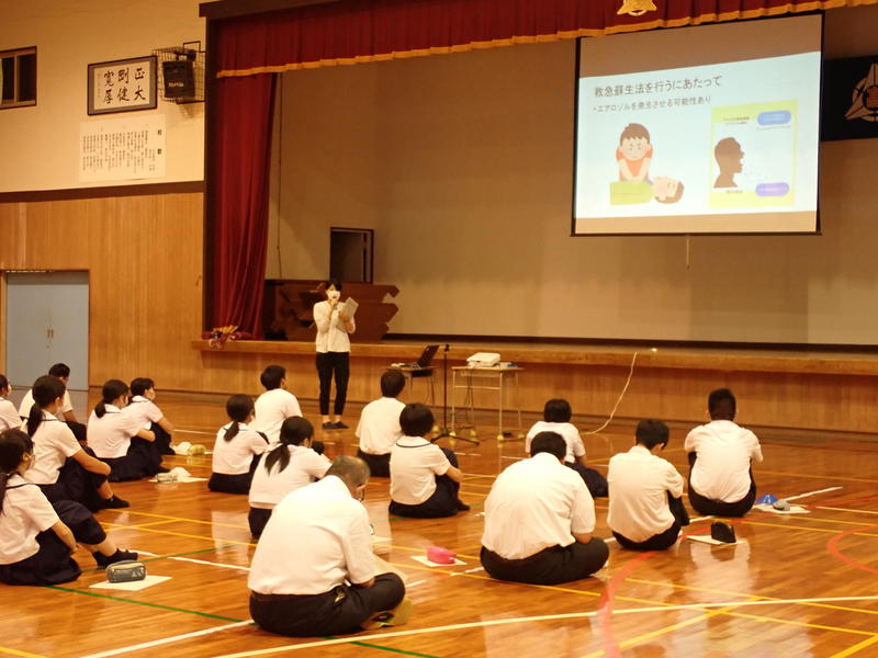 DVD鑑賞後生徒たちは、「初めて死戦期呼吸という心臓が止まってからする呼吸があることを知り、誰かが突然倒れた時に死戦期呼吸と普段通りの呼吸との違いに気付けるように呼吸の特徴を覚えておきたいと思う。」や「感染症予防もしながら、心肺蘇生をできるように身に付けていきたいと思う。また、医療関係の仕事につきたいので、一連の流れがすぐできるようにしたい。」、「これから海やキャンプの時期になるので、しっかりと今日学んだことを活かして、倒れている人をみつけたら、助けてあげたいと思った。」などの感想を書いていました。