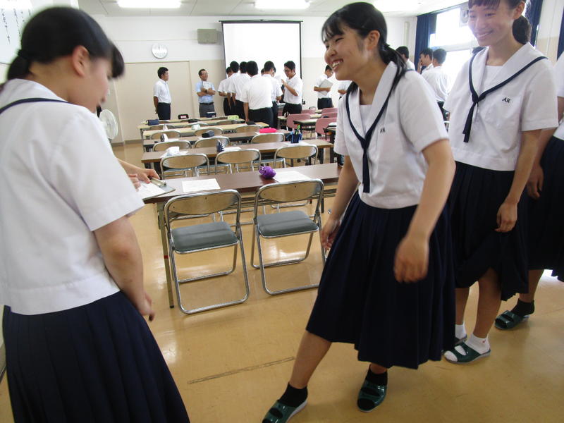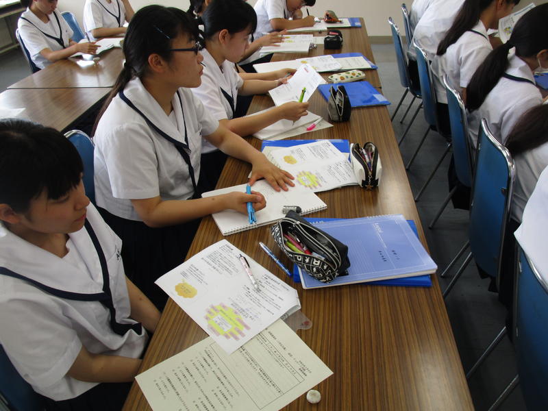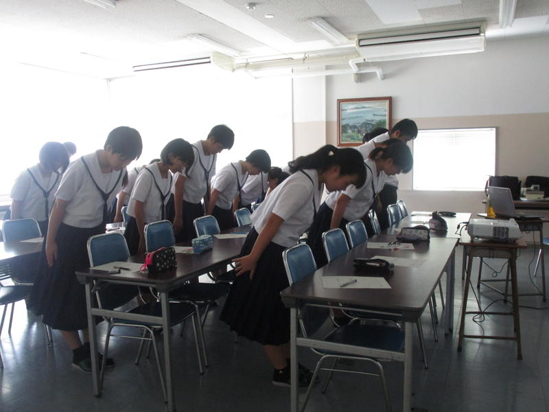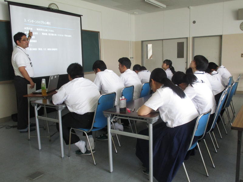 インターンシップは何のためにするのか、初対面の重要性、心構え、マナー等について講話をしていただきました。マナーの話ではお辞儀には3つの種類があることを学びました。首は曲げず、腰を曲げて礼をするということを意識しながら練習をしました。7月30日(火)~8月1日(木)のインターンシップを控え、生徒たちの意識向上に繋がる貴重な機会となりました。前田様ありがとうございました。