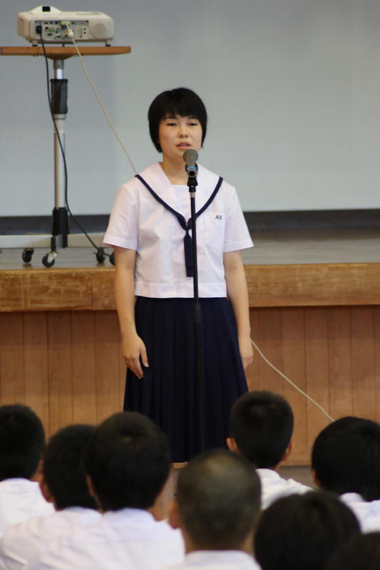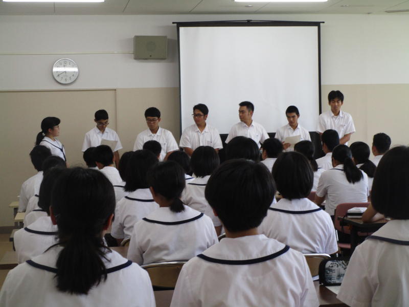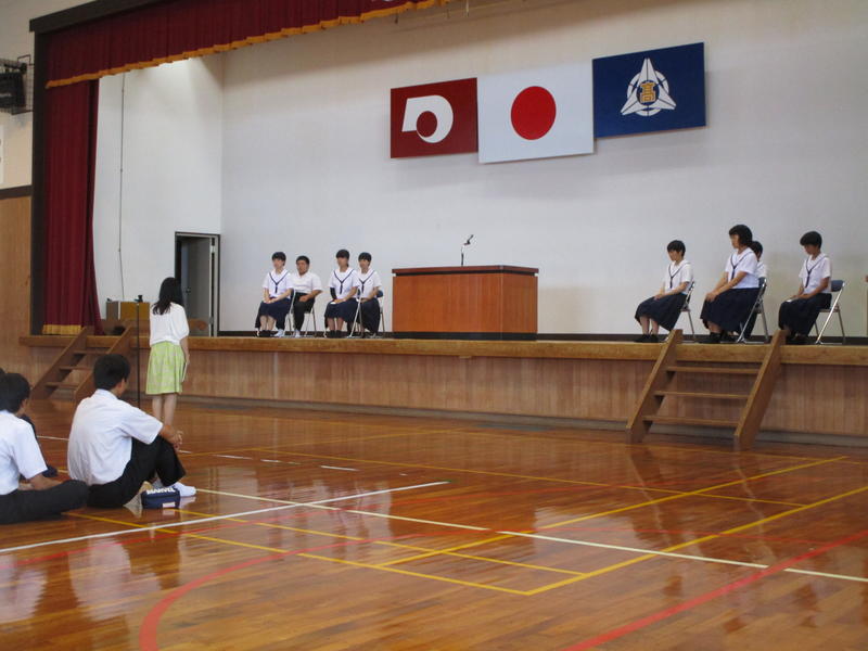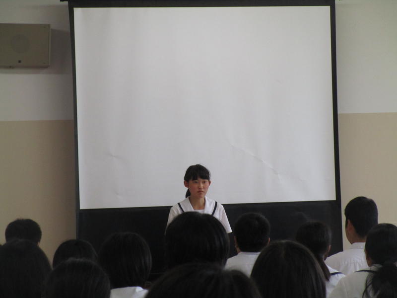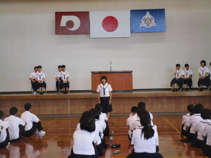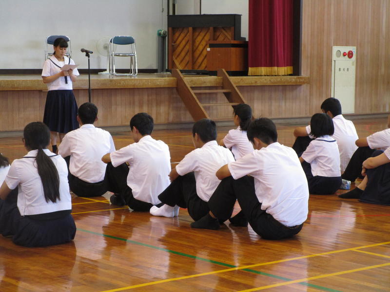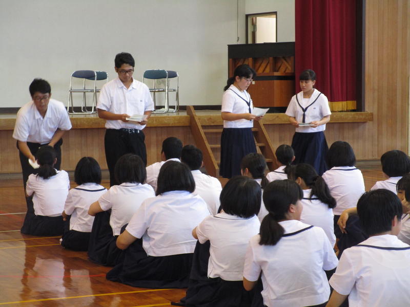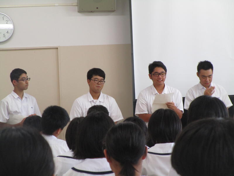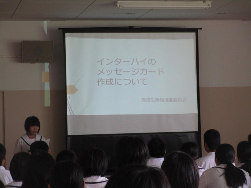 代議・風紀委員会主催の「夢を語ろうプロジェクト」は、3年生の男子生徒が夢や今後の目標について全校生徒の前で発表しました。交通委員会からは、交通安全週間について案内がありました。生徒会から、インターハイのメッセージカード作成についての説明がありました。熊本へ全国からの支援に対して感謝の気持ちを伝えるメッセージや試合に向けた応援メッセージを全校生徒で書いていきます。
