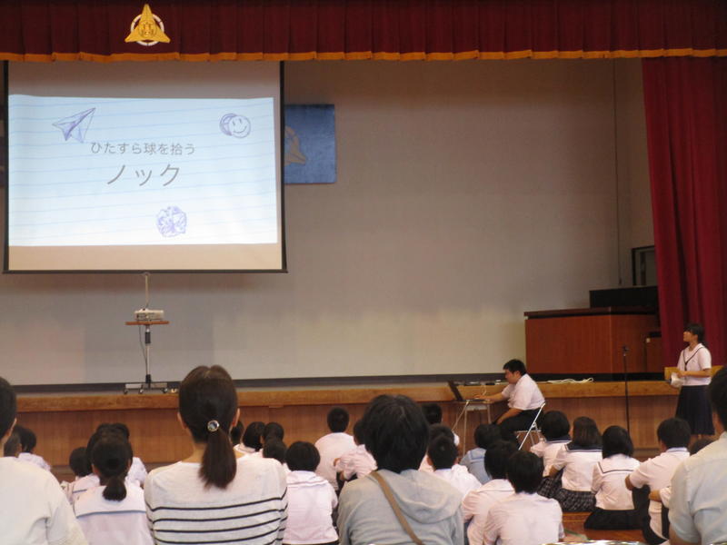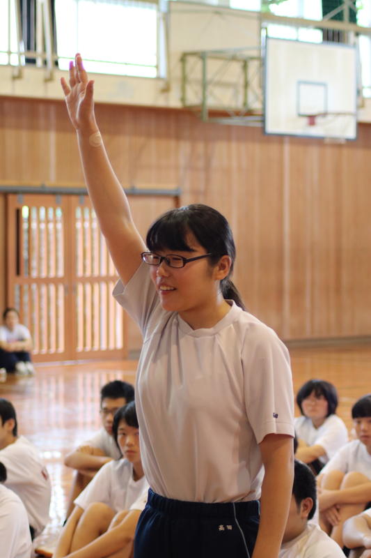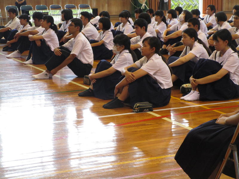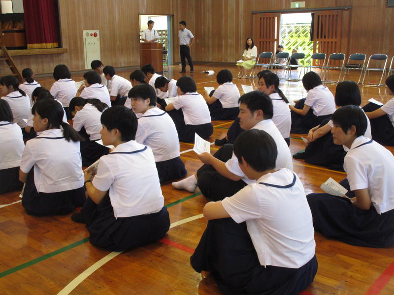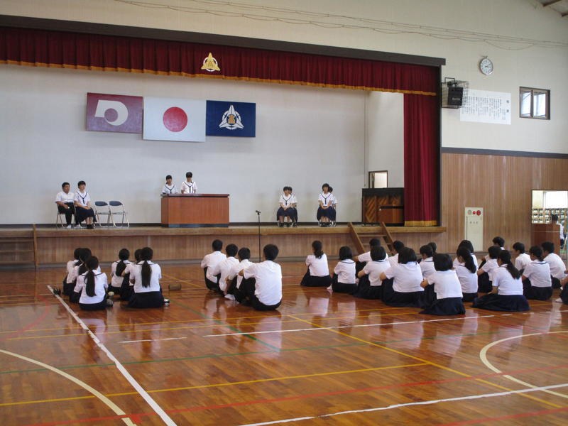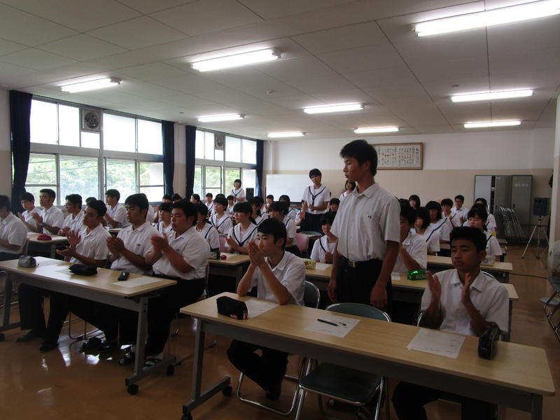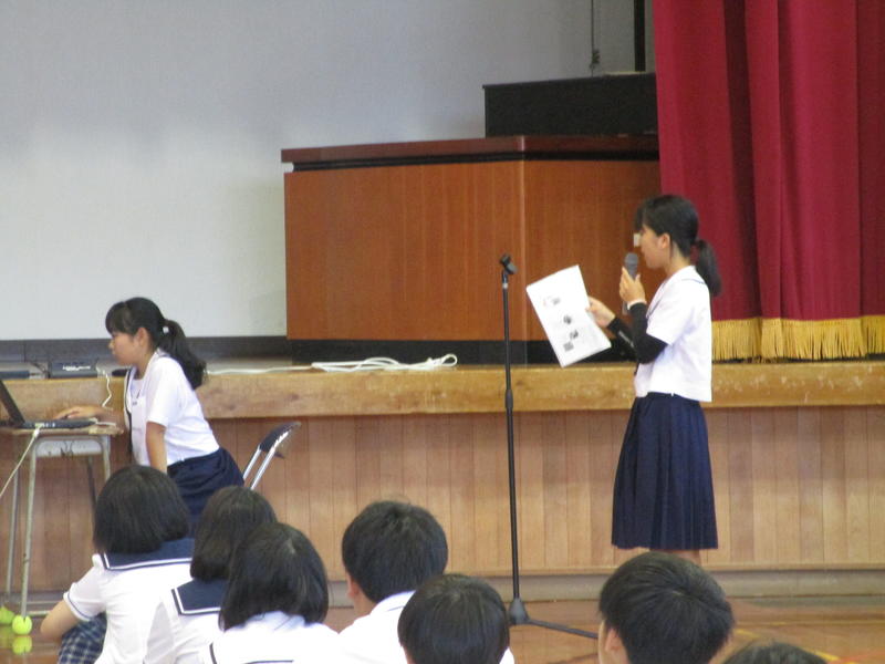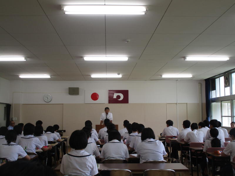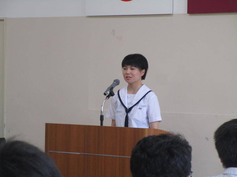 代議・風紀委員会主催の「夢を語ろうプロジェクト」は、3年生の男子生徒が夢や今後の目標について全校生徒の前で発表しました。交通委員会からは、交通安全週間について案内がありました。生徒会から、インターハイのメッセージカード作成についての説明がありました。熊本へ全国からの支援に対して感謝の気持ちを伝えるメッセージや試合に向けた応援メッセージを全校生徒で書いていきます。