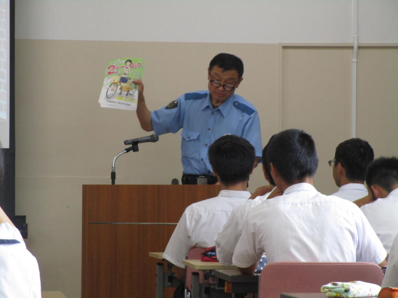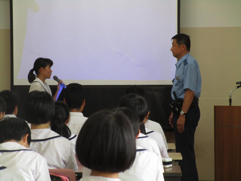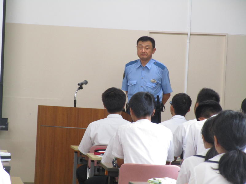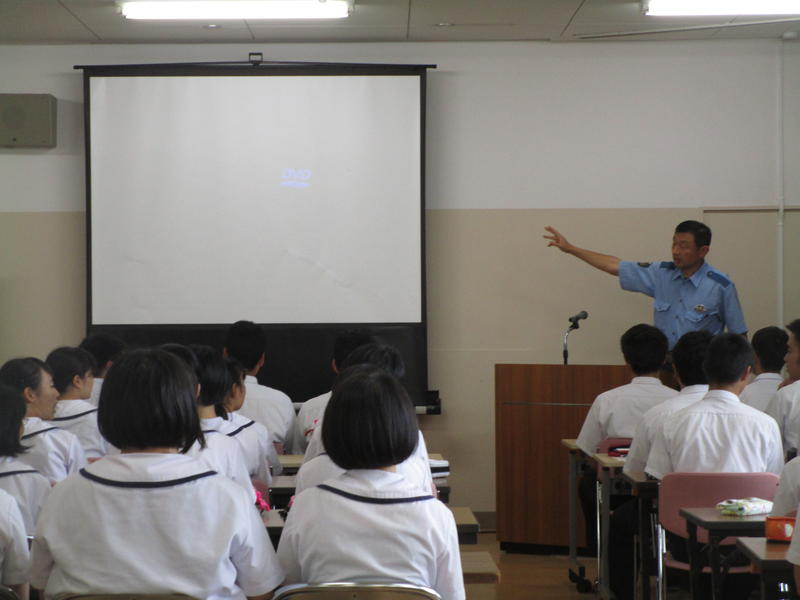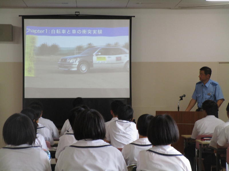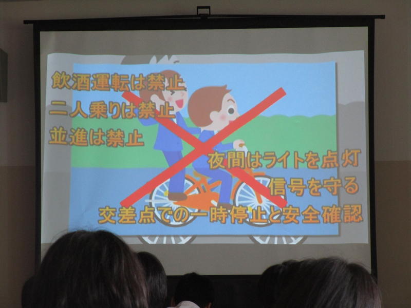 交通手段として生徒たちがよく使う自転車について講話をしていただきました。まず初めに、よくある交通事故についてのDVDを見せていただきました。傘を差しながらや音楽を聴きながらなどの「ながら運転」、「右側通行」、「並列運転」による事故が多いことが挙げられていました。加害者・被害者にならないためにも、交通マナーを守ることの大切さを学ぶことができ、生徒たちの意識向上に繋がる貴重な機会となりました。岡田様ありがとうございました。