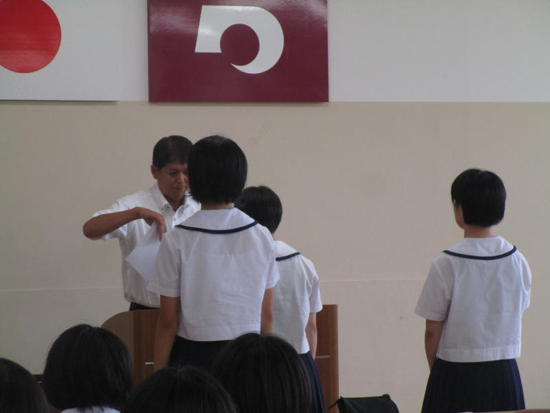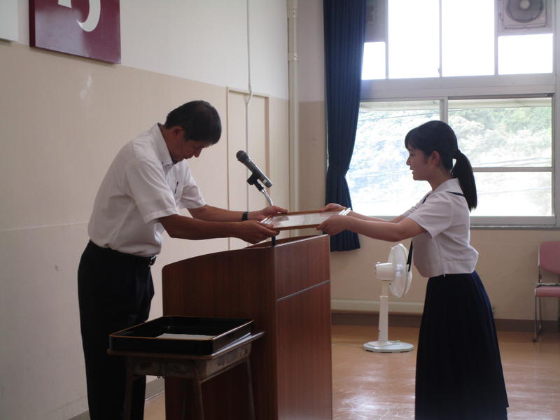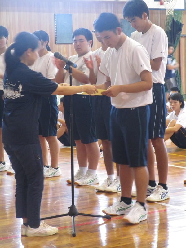 表彰式では、新体力テストや天草地区体育大会、英語技能検定、社会を明るくする運動標語コンテストなどで成績が優秀だった者たちへ表彰状を渡しました。