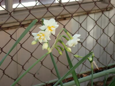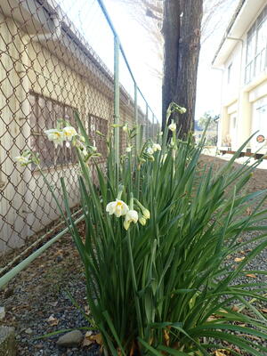 さて、昨日は寒の入りで、今朝も霜が降りる寒さでしたが、日中は輝く太陽がまぶしい、さわやかな日です。体育館と武道場の間のフェンス脇では、スイセンが咲き始めました!