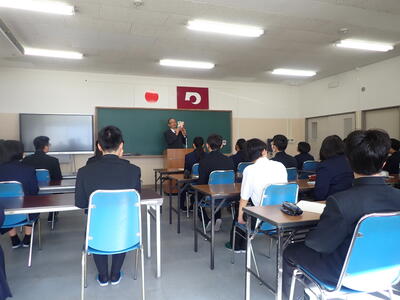 まず、先日14日(日)に実施した長距離走大会(えびすマラソン10kmの部)の男子・女子各1位、第38回熊本県高等学校総合文化祭標語募集入賞者、日本漢字能力検定合格者の表彰がありました。