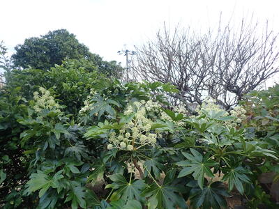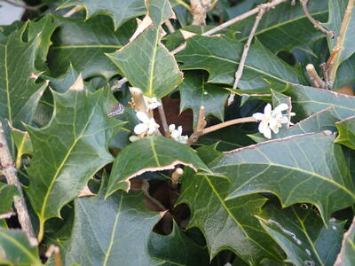 小さな白い花であまり目立ちませんが、前から少しずつ咲き続けています。なお、これは日本のモクセイ科のヒイラギで、クリスマスケーキの上などに飾りであしらわれて赤い実をつけるセイヨウヒイラギ(モチノキ科)とはちょっと違うそうです。しかし、とげがある点で、東西どちらにおいても魔除けの意味をもつようです。