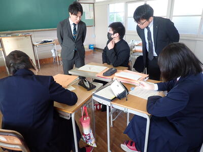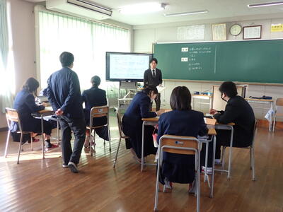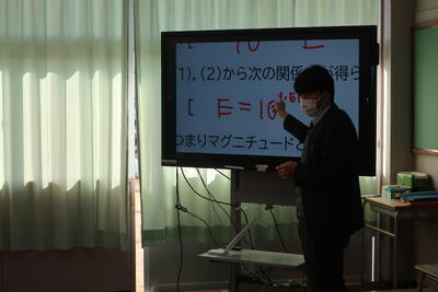まず始めに、今年で10年の節目の年になる「熊本地震」について考えました。本校の数学・理科教諭はそれぞれ、熊本地震を熊本市内で経験し、大きな被害を受けました。当時の話を通して、地震の「エネルギー」に目を向けてもらい、本時の目標と流れを確認しました。