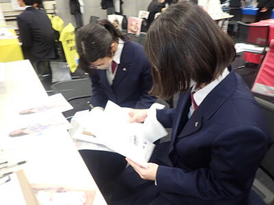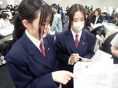 午後は熊本城ホールに移動して進路ガイダンスに参加しました。企業や大学・専門学校、公務員のブースが準備されており、参加した生徒はそれぞれが興味のある場所へ移動し、説明を受けました。