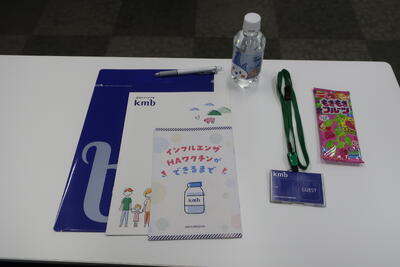 まずは午前中の様子です。初めにKMバイオロジクス株式会社様の企業説明と、インフルエンザワクチンができるまでの行程について説明をしていただきました。KMバイオロジクス株式会社様の社名にも入っている「M」は、「明治乳業株式会社」の頭文字に由来するそうで、明治グループの企業とのことでした。生徒達への配付物の中には、子どもに大人気のもぎもぎフルーツの姿が・・・!
