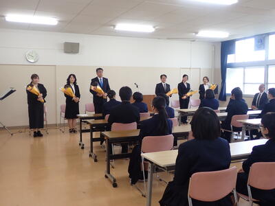 3月27日(金)の午前、倉岳校で転退任式がありました。今年度は3名のご転出の先生、