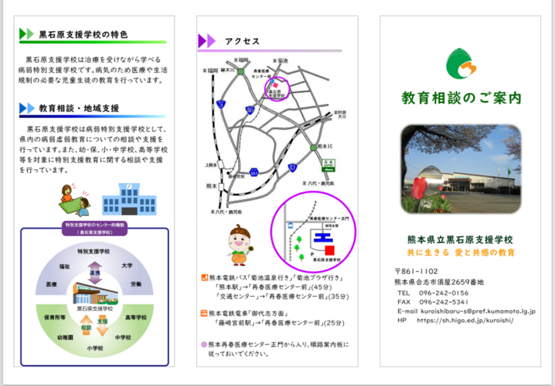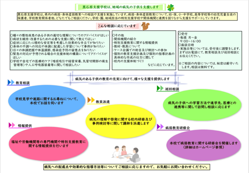 黒石原支援学校は、県内の病弱・身体虚弱教育への相談や支援を実施しています。学校・園、地域担当の特別支援学校や関係機関と連携を図りながら支援をサポートしていきます。