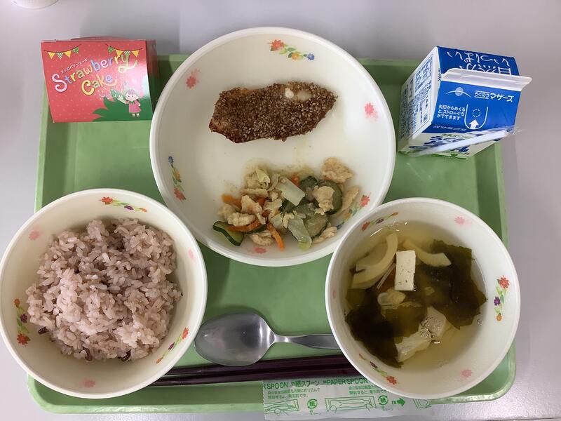 「赤飯、牛乳、わかたけ汁、赤魚のみりん焼き、南関揚げの酢の物、お祝いいちごケーキ」でした。