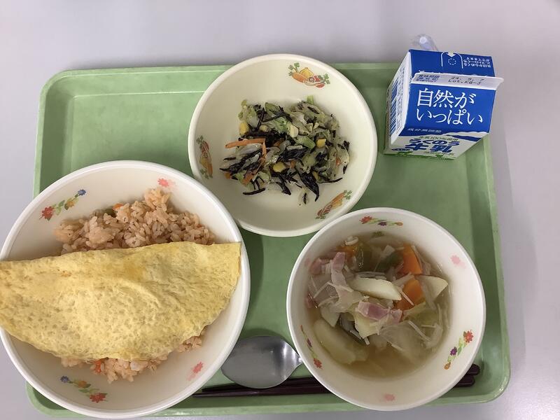 4月26日は、「セルフオムライス、牛乳、野菜のスープ煮、ひじきサラダ」でした。