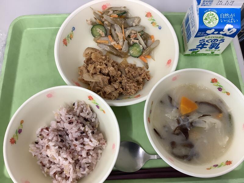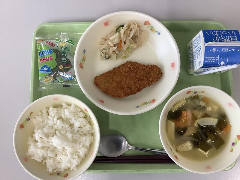 メニューは「ごはん、牛乳、筍のみそ汁、かつおフライ、切干大根のすのもの、かしわ餅」でした。