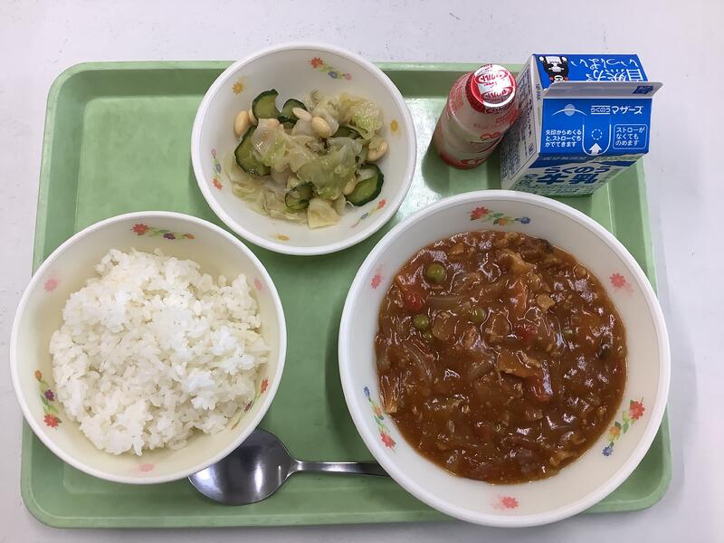 11月13日は「トマトのハヤシライス(菊池米使用)、じゃこ豆サラダ、ヤクルト」でした。