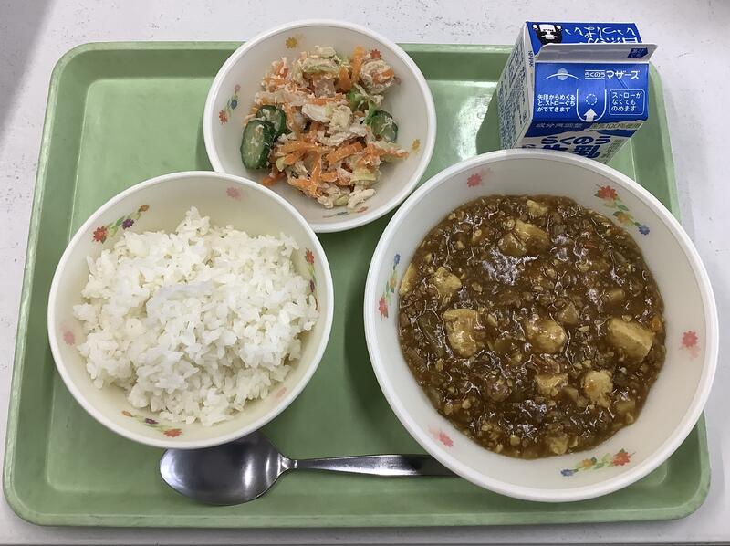 11月26日は「ごはん、カレー麻婆豆腐、棒棒鶏サラダ」でした。