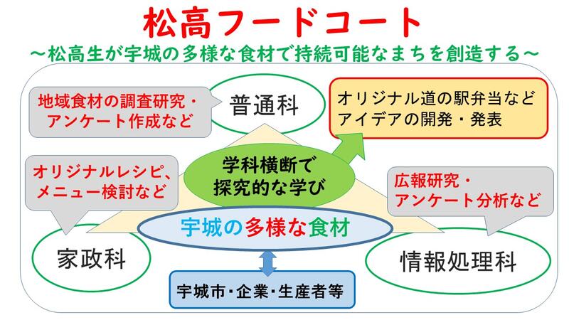 生徒が「全学科(普通科・家政科・情報処理科)で取り組む学科横断で探究的な学び」により、宇城市や支援企業、地元生産者等と連携・協働し、多様な地元食材を活用して研究・開発したアイデア(食品やメニュー等)の提案・発表を目指します。(下のイメージ図参照)