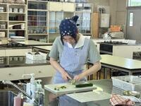 授業では本番にむけて、「きゅうり」の半月切りを30秒間で何枚切れか練習しました目標は、30秒間で50枚以上、厚さ2mm以下の半月切りをすること