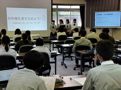 「松高フードコート」プロジェクトの一環として、普通科地域創造コースの1年生が「宇城地域の食材の魅力と提案」について発表を行いました入学からわずか2か月あまりとは思えないほど、プレゼン資料の作成や、発表する姿が堂々としており、一人ひとりが真剣に取り組み、この短期間で大きく成長した様子にとても頼もしく思いました