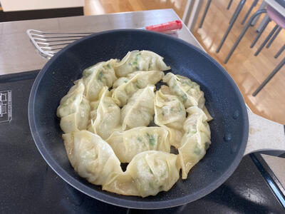 では、日常生活に役立つ食の知識や調理技術を学んでいます。今回の授業では、調理実習を行い、餃子作りに挑戦しました。