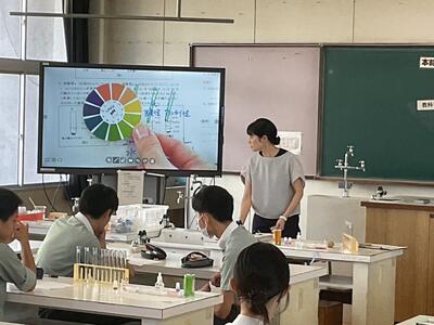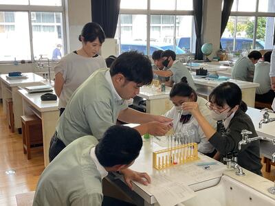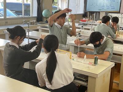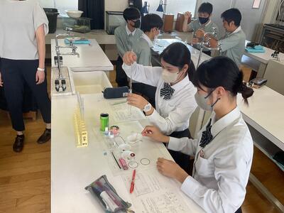 3年生の生物の授業で、酵素(カタラーゼ)の働きを観察する実験を行いました。過酸化水素水に肝臓を加えることで発生する泡(酸素)をもとに、温度やpHの違いによる反応の変化を比較しました。泡の量や反応の速さから、酵素が環境によって働き方を変えることを体感しました。