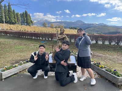 午前は、阿蘇にある「熊本地震ミュージアムKIOKU」を訪問し、東海大学旧阿蘇キャンパスの校舎や、地震によって崩壊した阿蘇大橋の案内標識などを見ることができました。校外研修ならではの学びとなりました。
